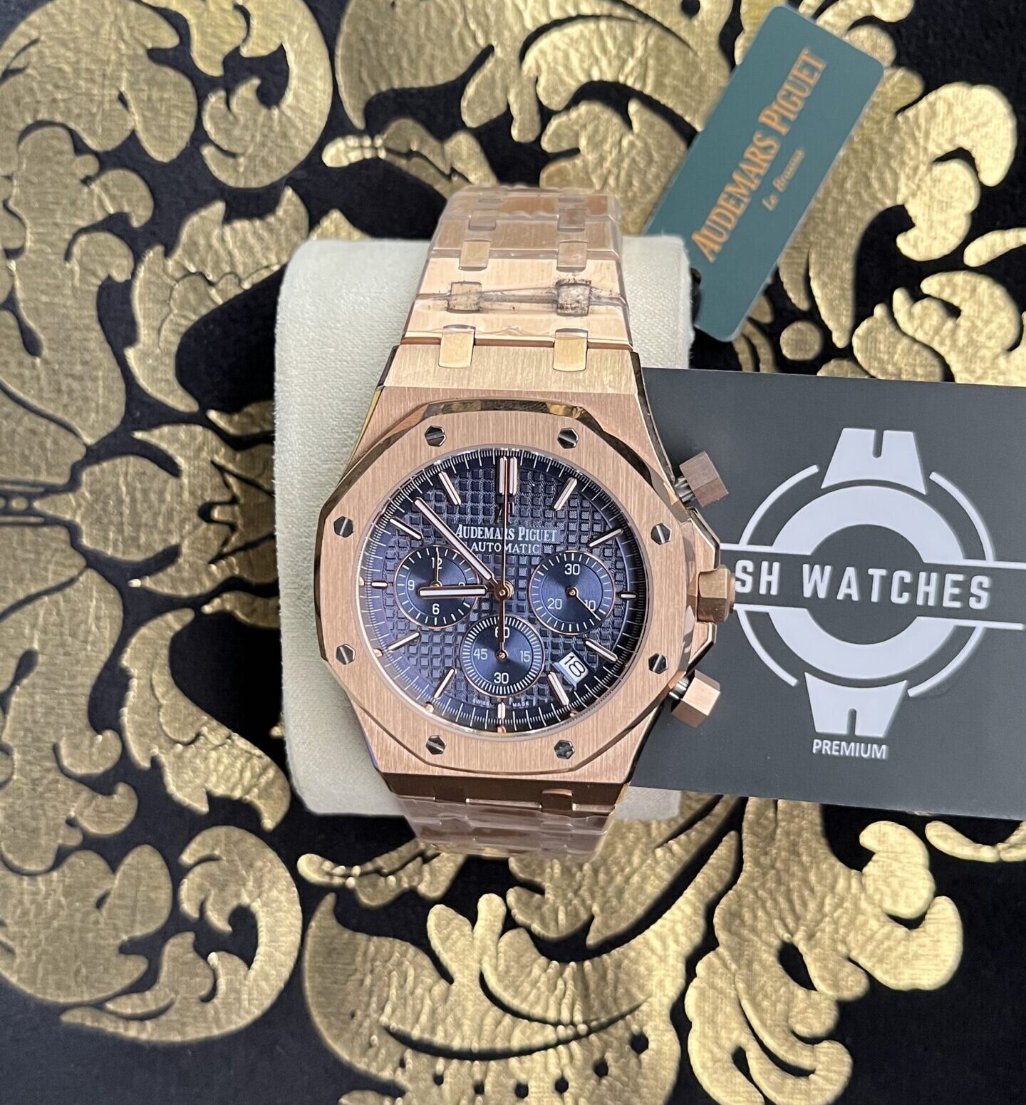 Bold, refined, and instantly recognizable — this Royal Oak Chronograph features a striking blue dial contrasted by a luxurious rose gold finish. Crafted with sapphire glass and premium detailing, this master copy delivers the prestige of Audemars Piguet design with reliable performance and timeless style.